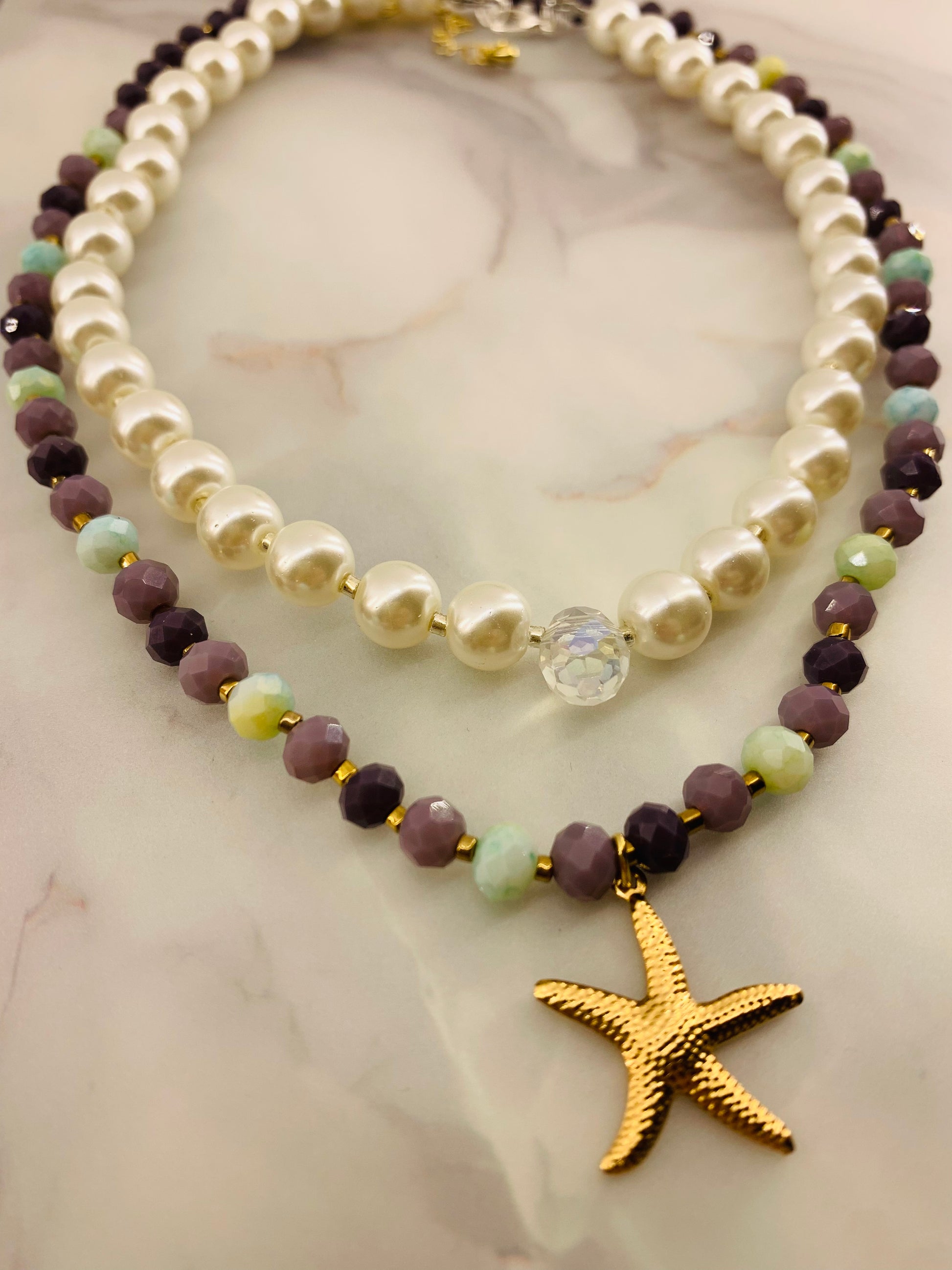 ✨ Collar artesanal en cristal facetado malva con estrella de mar bañada en oro 🌊💜