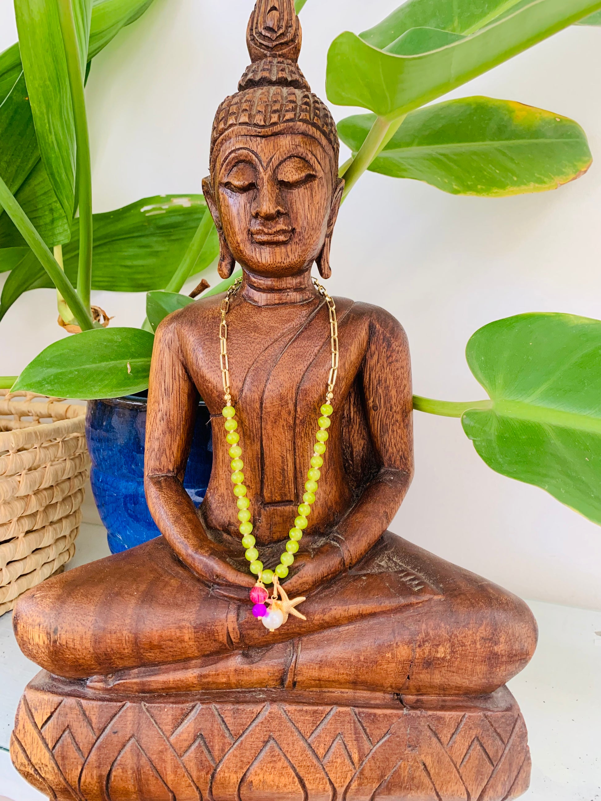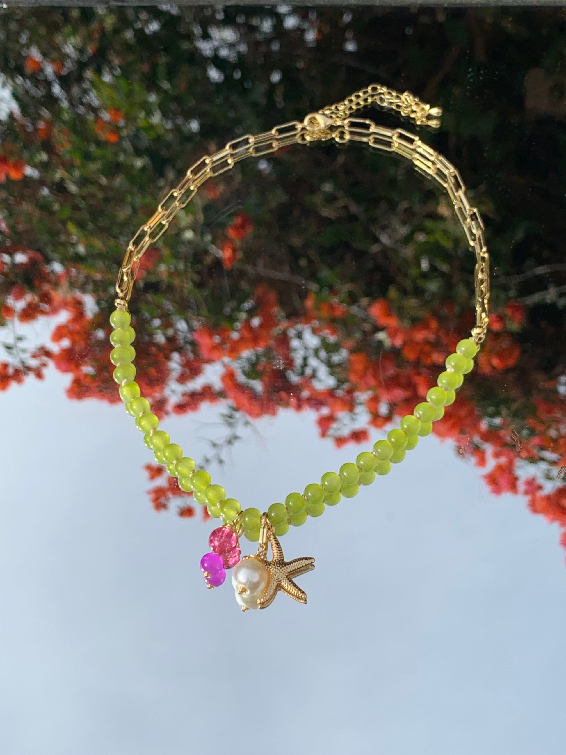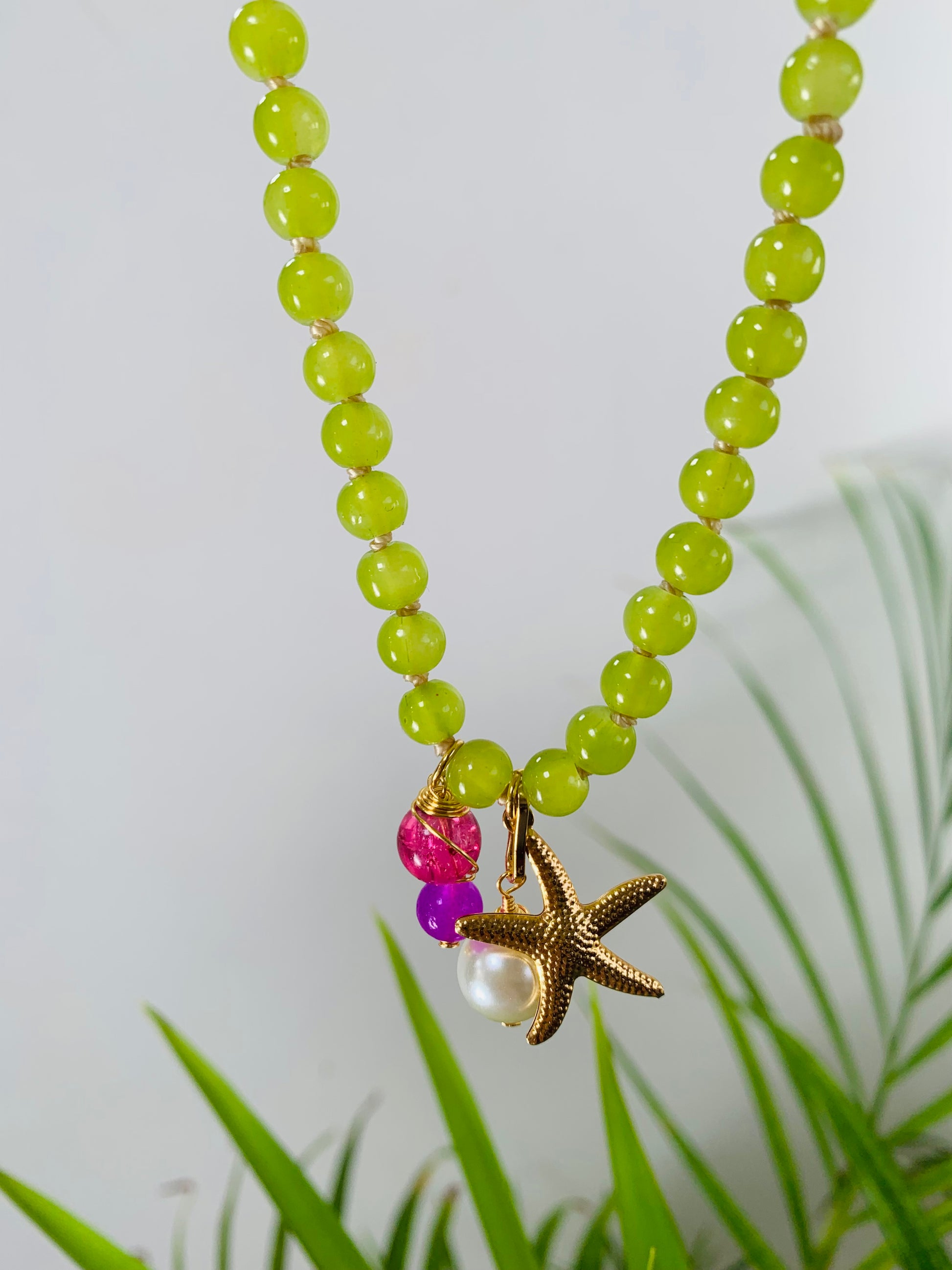 ¡Hazte con el collar perfecto para el verano! Inspirado por la energía del sol, cuenta con cuentas de vidrio de 6mm, hilo encerado, cadena y conectores en baño oro. Completa con una estrellita de mar y un charm de cristal para un toque extra de brillo.