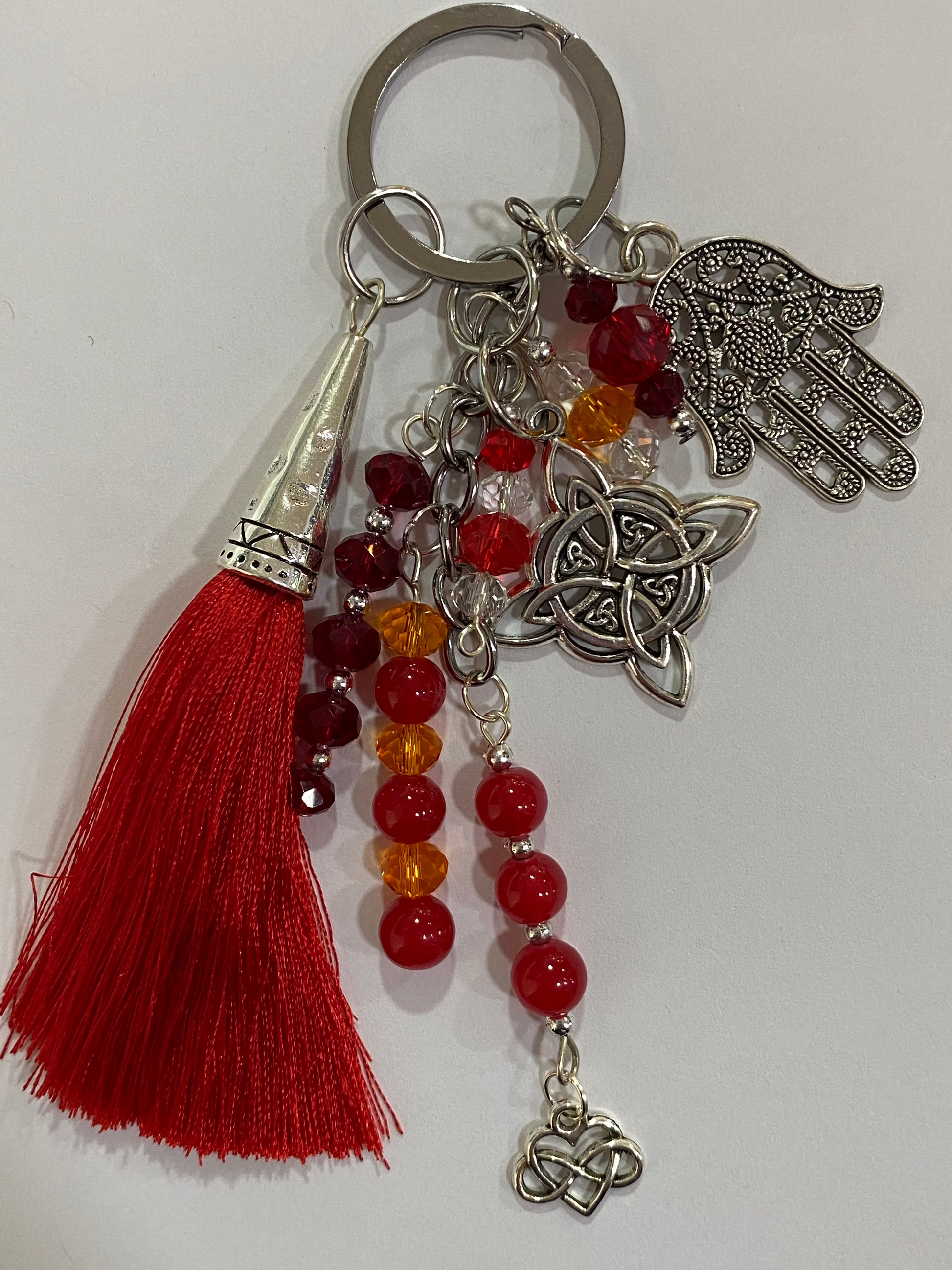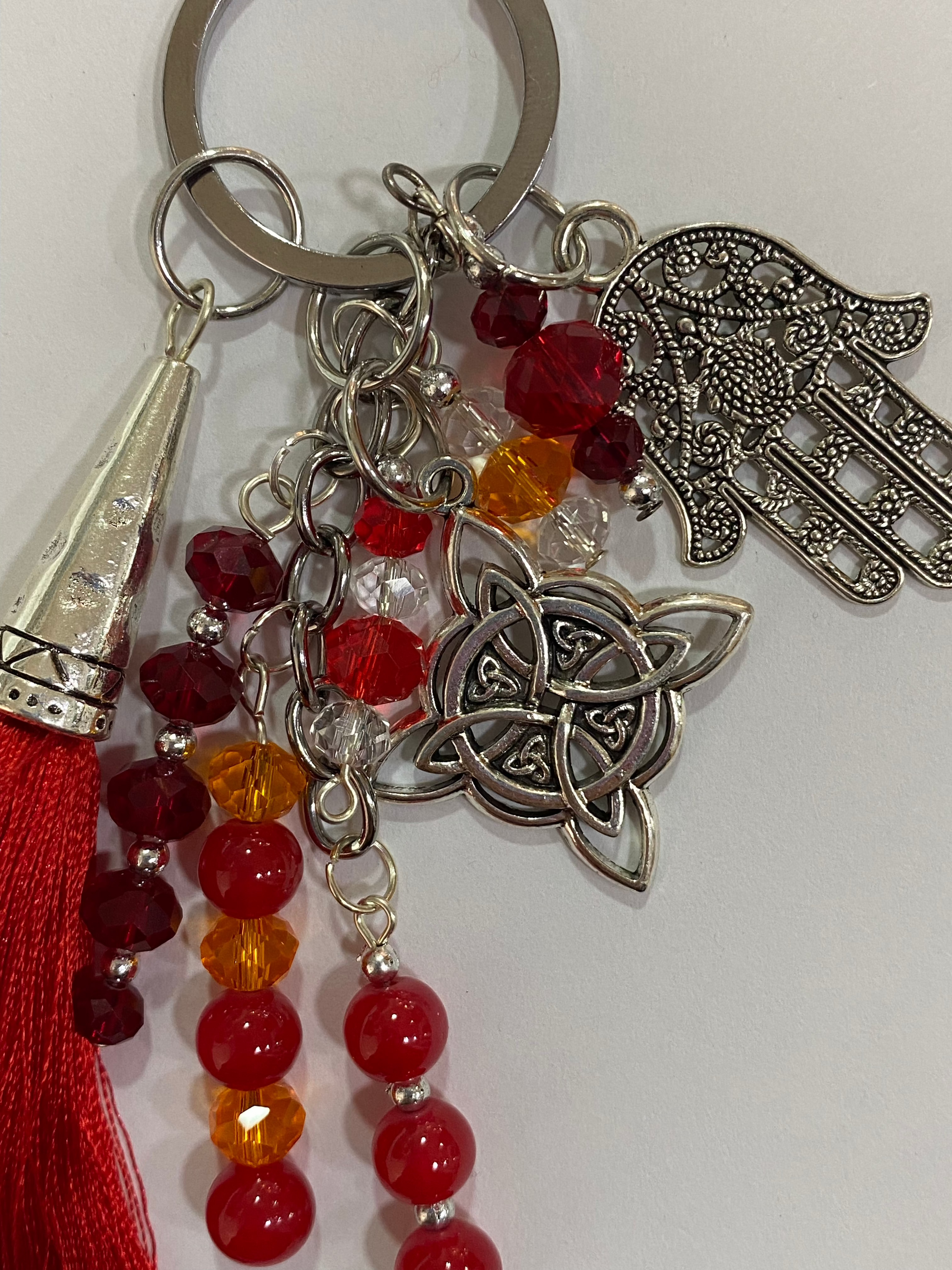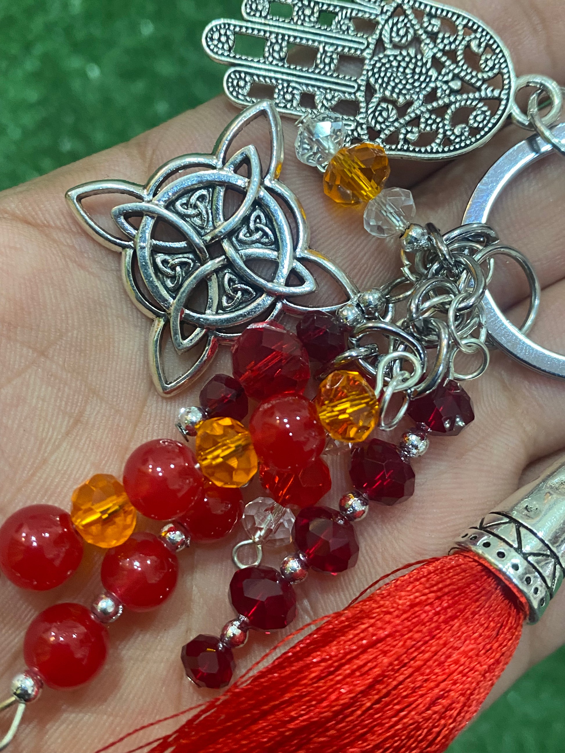 Llavero en tonos rojos con mano de Fátima y nudo de bruja plateados