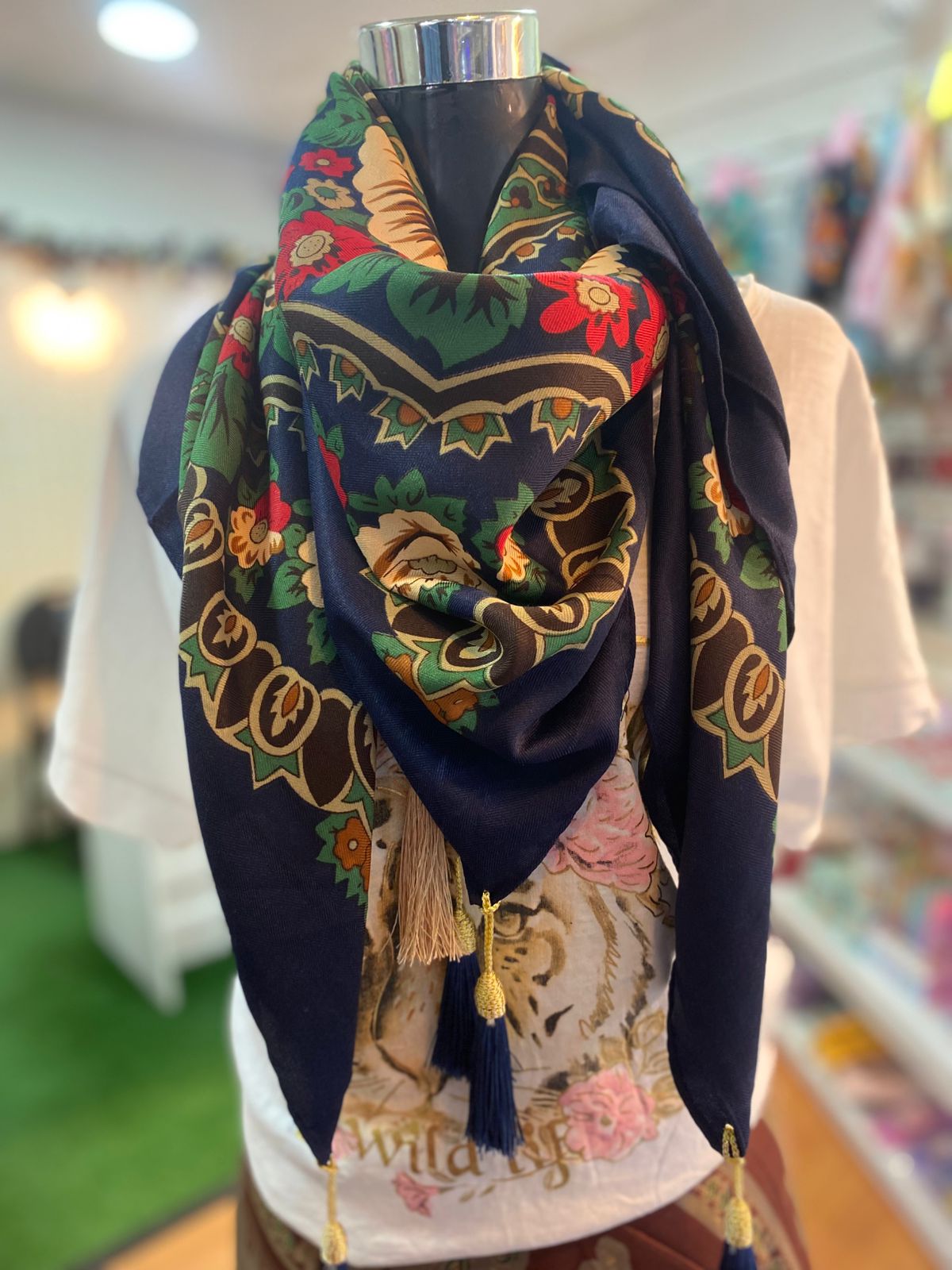 ¡Dale un toque de color y alegría a tu look! Este hermoso pañuelo de fondo azul está decorado con 🌺 flores rojas vibrantes, 🌿 hojitas verdes frescas y delicados detalles en tonos café 🌰 que le dan un aire natural y encantador. Su textura suave como una caricia lo hace perfecto para llevarlo todo el día con comodidad.
