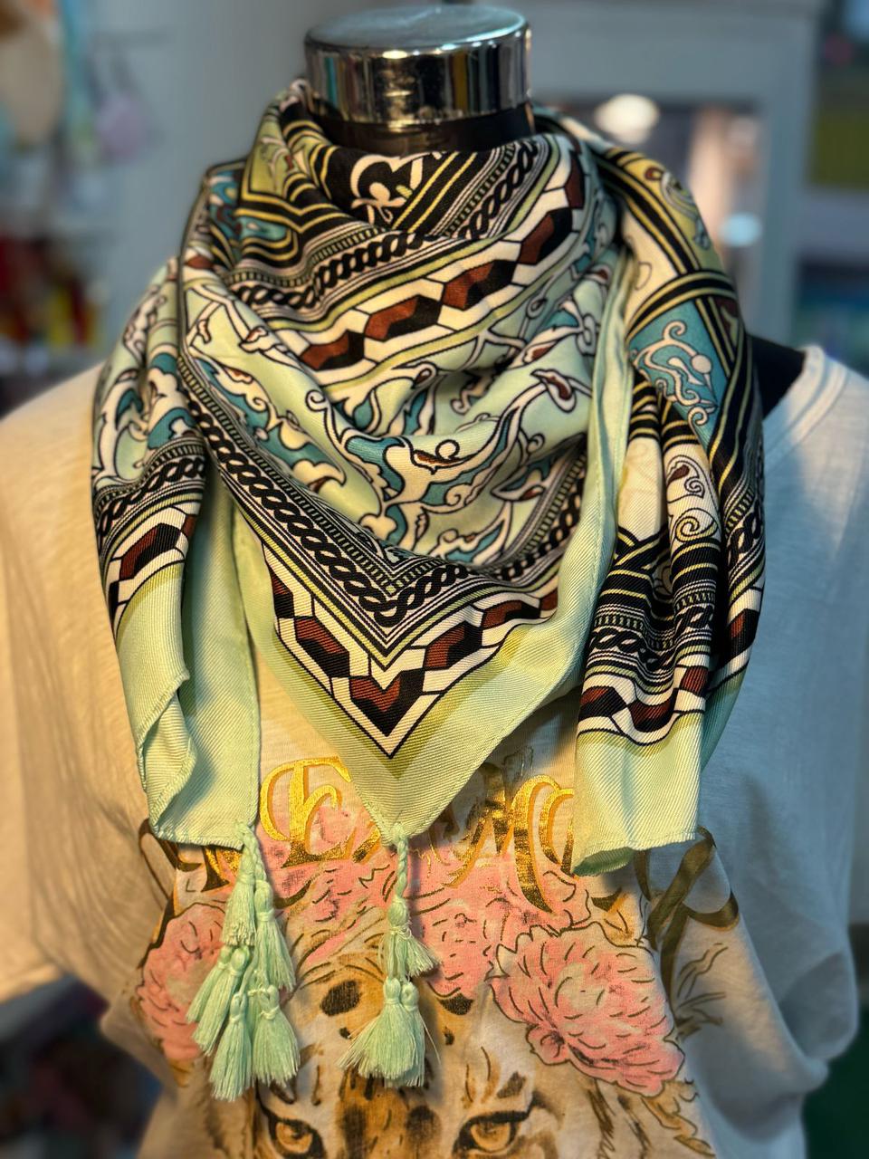 Este pañuelo verde agua 🌿 combina tonos café ☕ y turquesa 💎 en un diseño lleno de vida y elegancia. Su textura ultra suave te envuelve con comodidad y calidez 🤗, ideal para cualquier época del año.