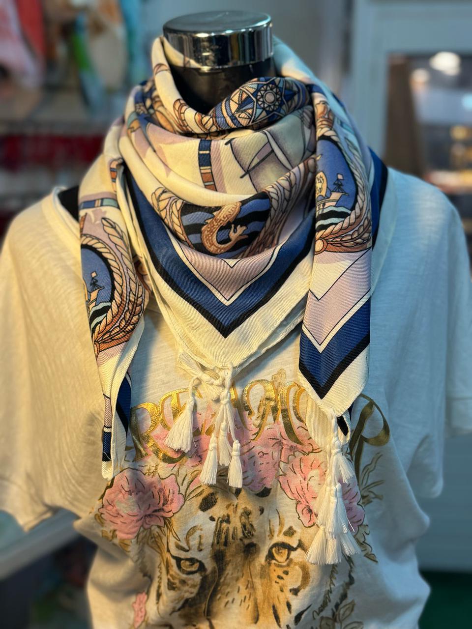 Este pañuelo blanco con delicados toques de azul es perfecto para darle vida a cualquier outfit. Su textura suave y ligera lo convierte en el accesorio ideal para cualquier temporada. Imagina envolver tu cuello con una brisa fresca y llena de estilo.