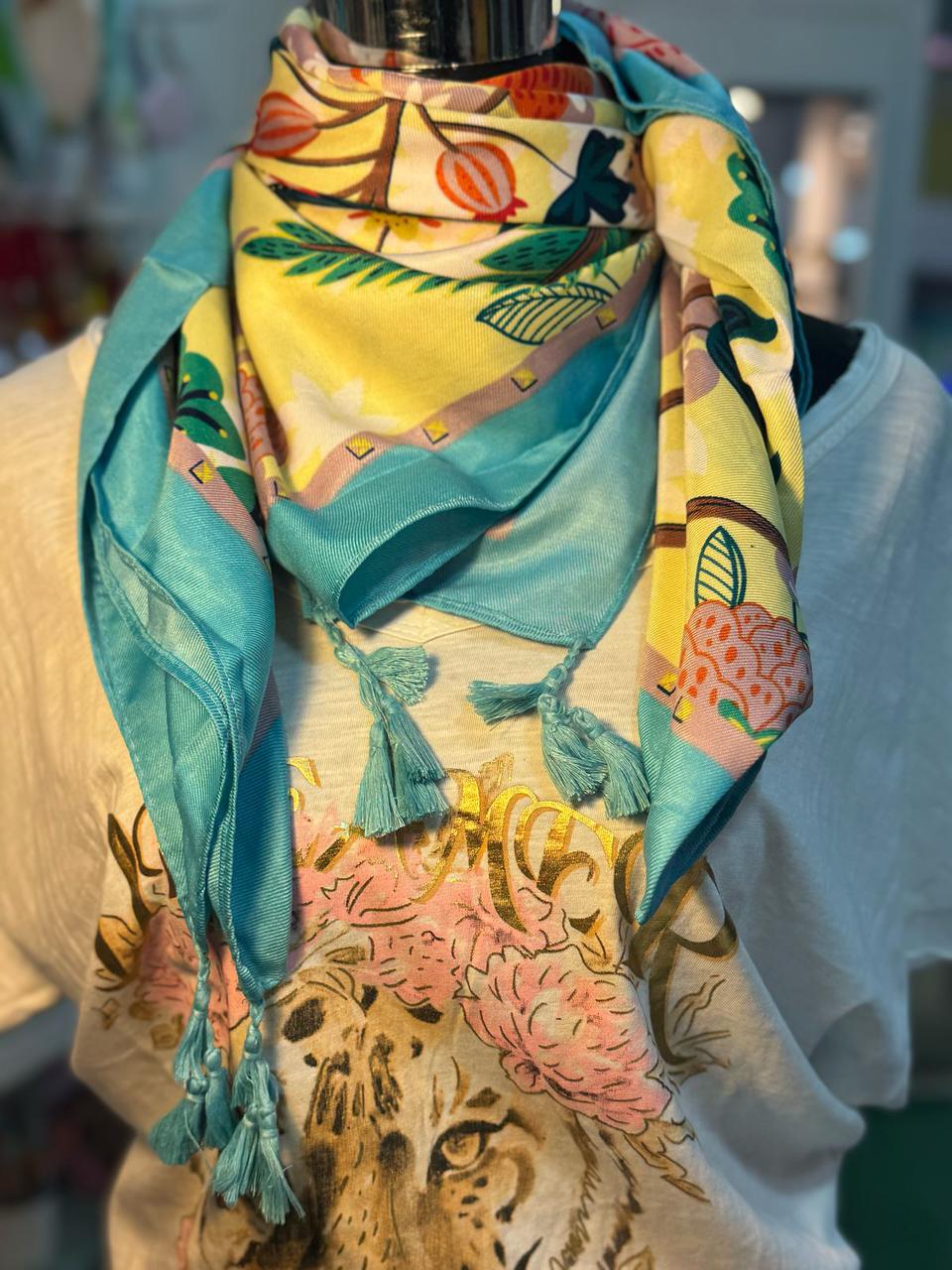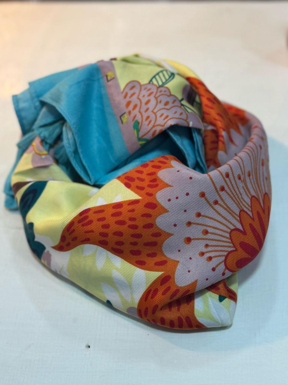 Este pañuelo celeste con tonos amarillos brillantes y delicadas flores naranjas 🌼🌸 es como un pedacito de cielo en primavera. Su textura suave al tacto lo hace perfecto para llevar todo el día con total comodidad ✨.