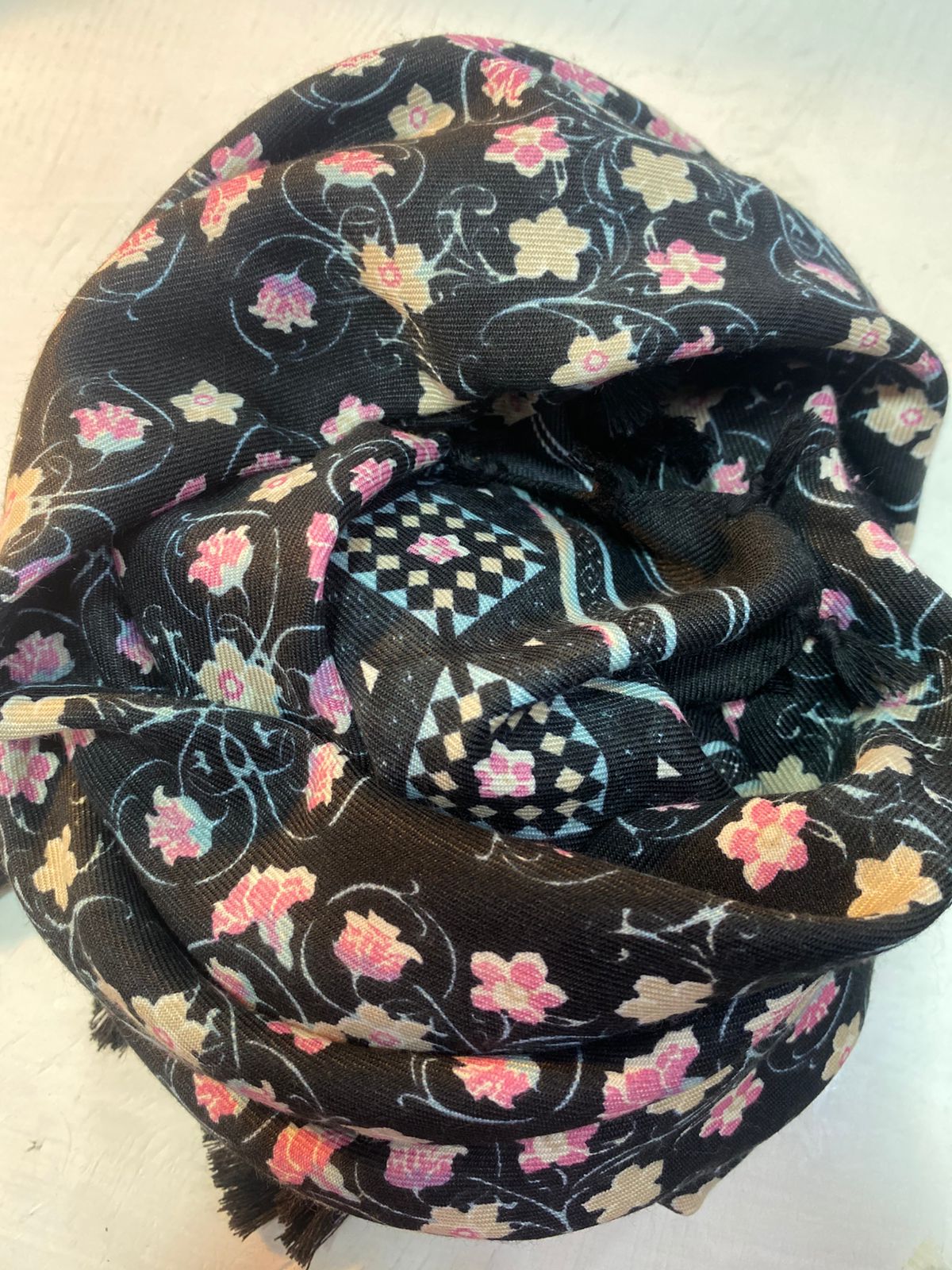✨ Este elegante pañuelo negro está lleno de encanto con pequeñas flores rosadas que le dan un toque dulce y femenino 🌸💖.