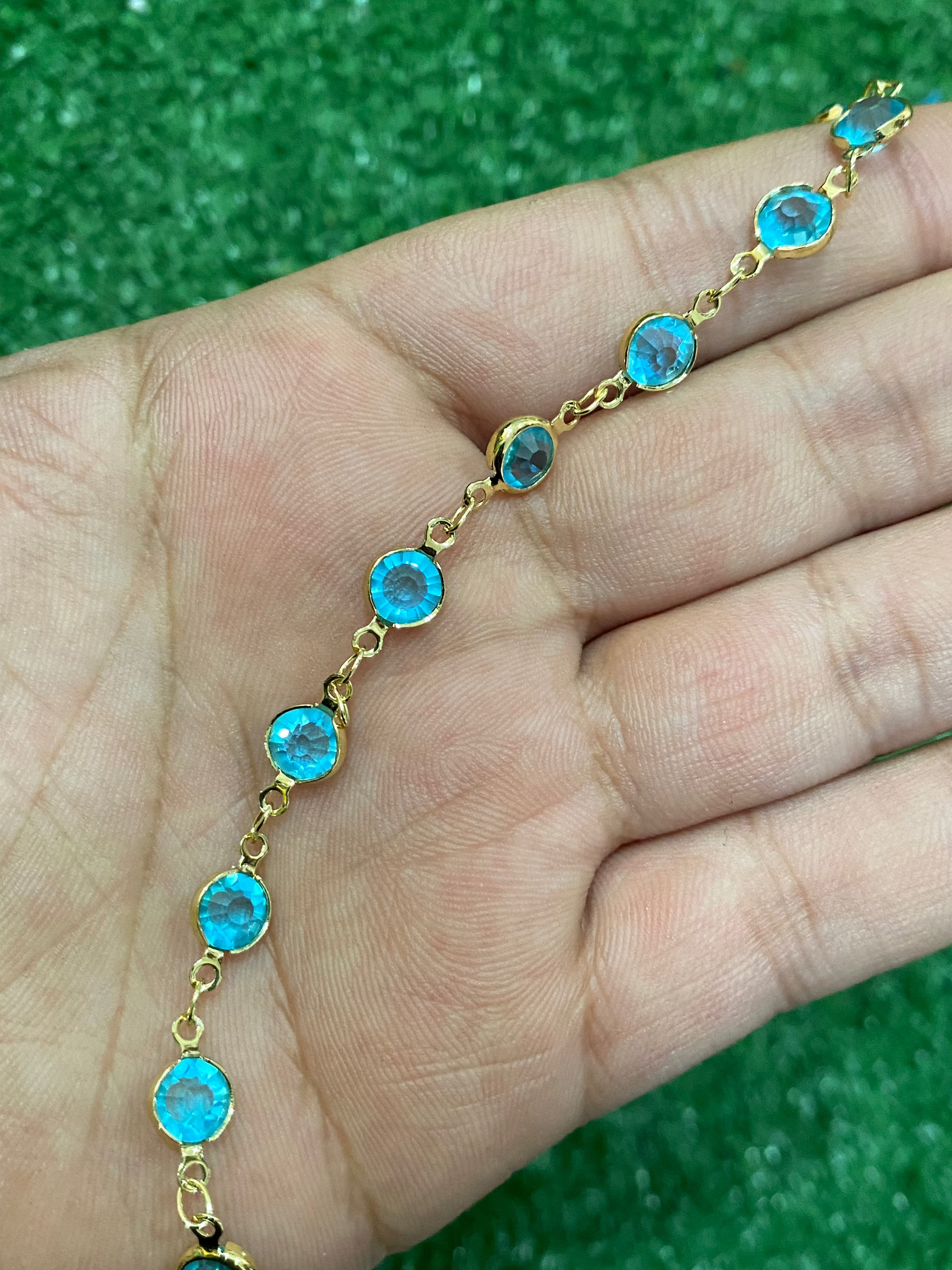 ¡Agrega un toque de brillo y elegancia a tu estilo con esta hermosa pulsera! 💎✨ Hecha de cobre de alta calidad, bañada en oro, y adornada con delicados cristales de color celeste que capturan la luz de manera mágica. 🌟