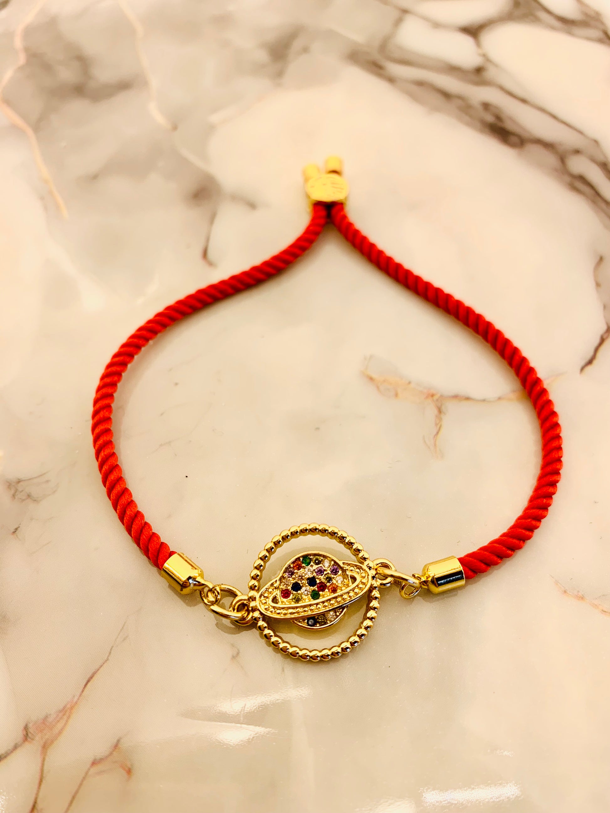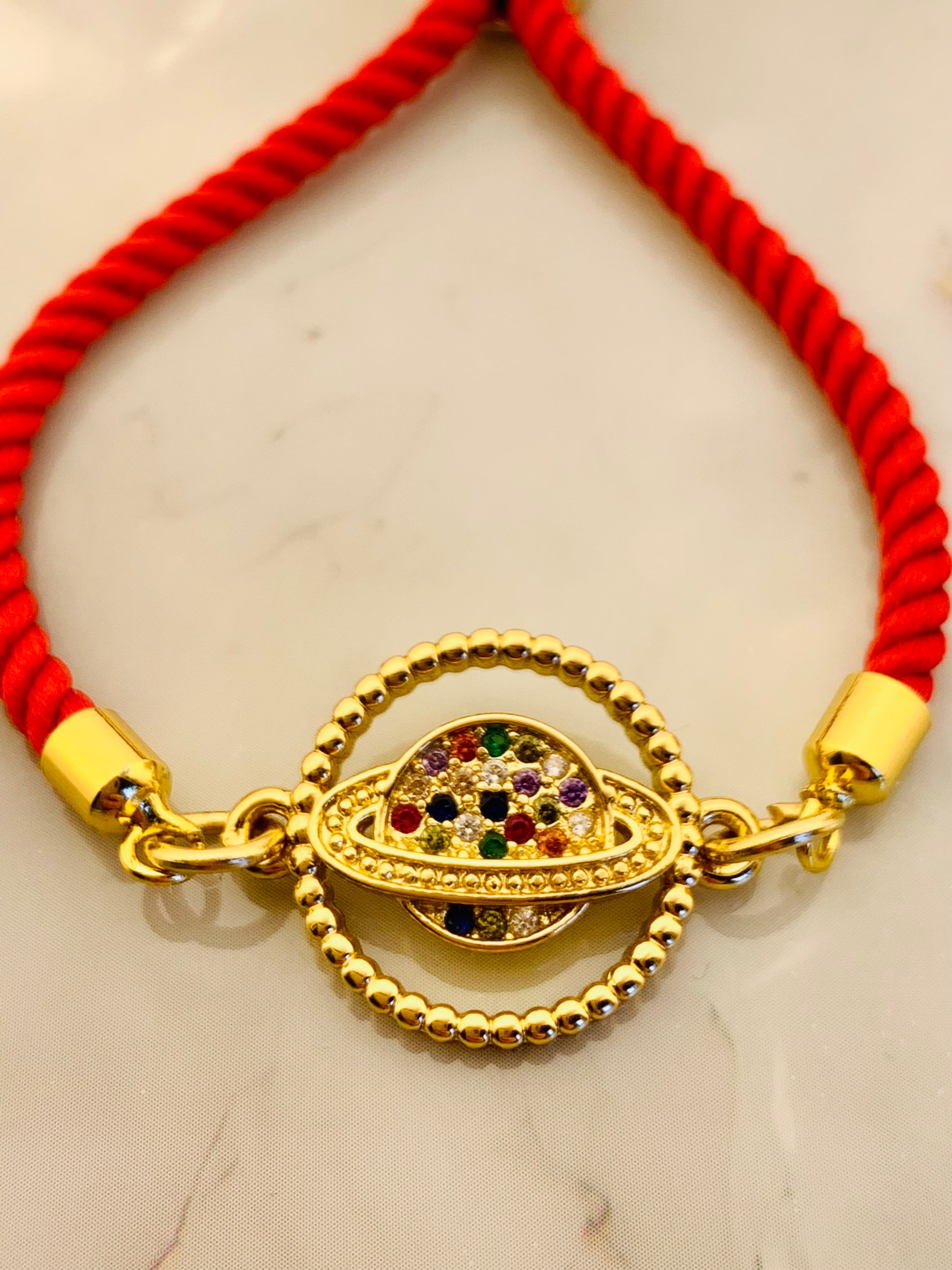 Esta pulsera roja de cordón con terminales baño oro y dije conector de Saturno con micro circones de colores baño en oro, es una adición perfecta a cualquier outfit. Hecha a mano la hacen una pieza única y atractiva.